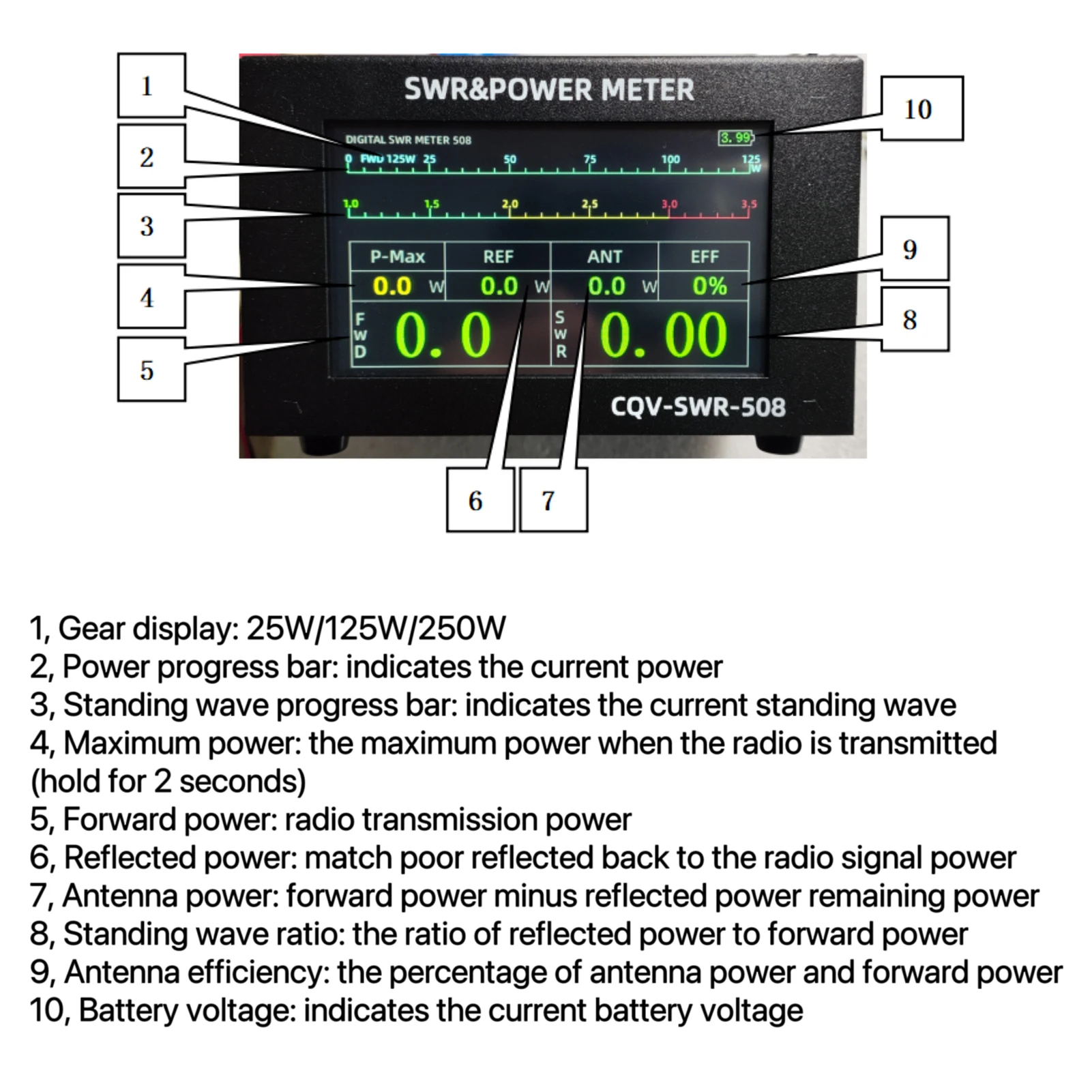 【4.3″ IPS Color Display】: Equipped with a 4.3″ IPS color display, ensures clear definition visibility at 480*272 resolution, providing comprehensive readability for both forward and reverse power, max power, forward power, reflected power, antenna power, standing waves ratio, battery voltage, etc. Support power progress bar function, view your parameters clearly and accurately with this intuitive interface.