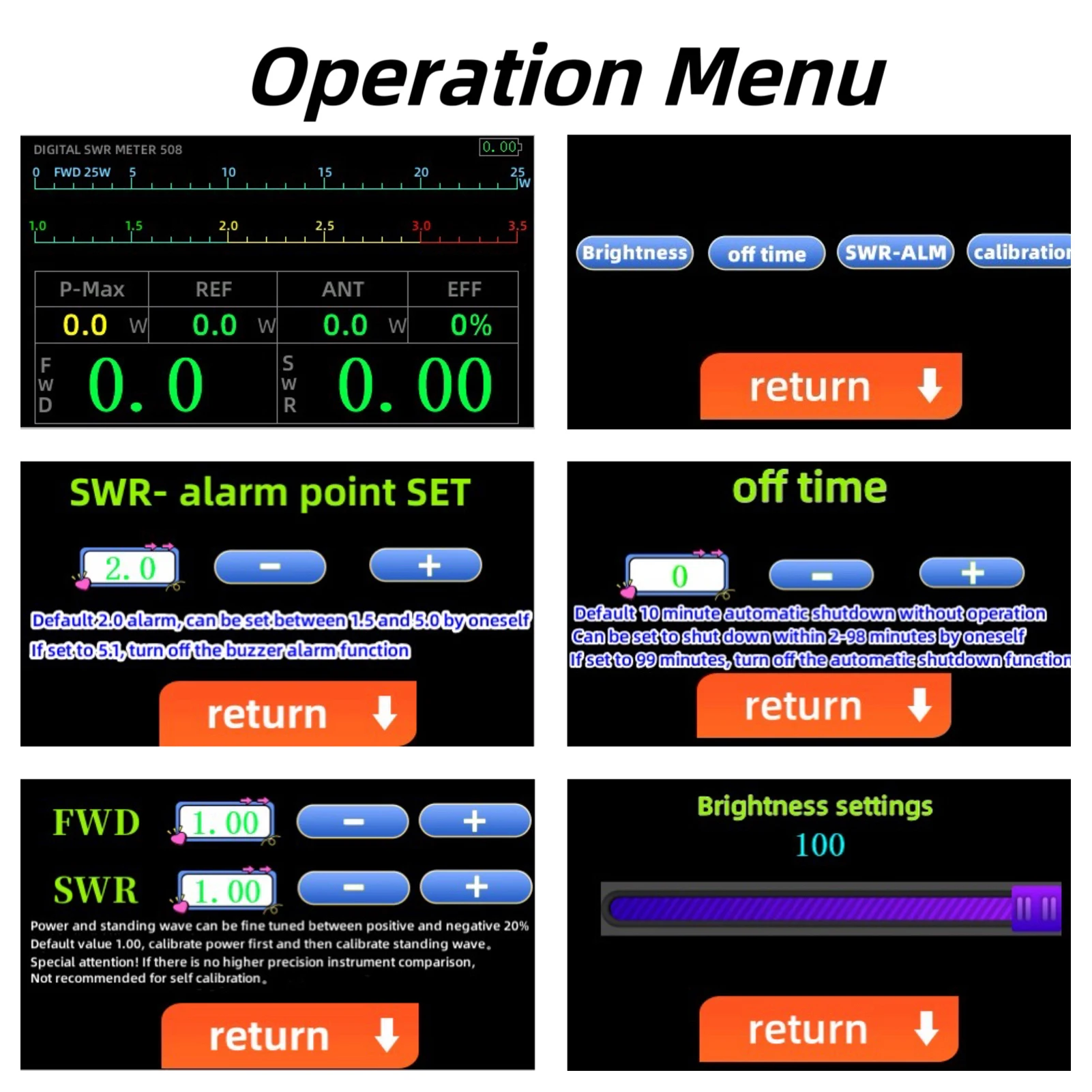 This standing waves meter not only supports forward/refverse, power/standing waves multiple parameters direct reading, but also has a high standing waves alarm, time delay shutdown, transmit auto power on and other functions to meet a variety of needs.4.3 inch IPS color LCD display, data reading is more clear, more convenient operation. This SWR meter has a maximum power handling capacity of 200 watts, 1-99.9 standing waverange, and a 1.8-54Mhz operating frequency. With power fine-tuning function and standing waves fine-tuning function, making the measurement results more accurate.