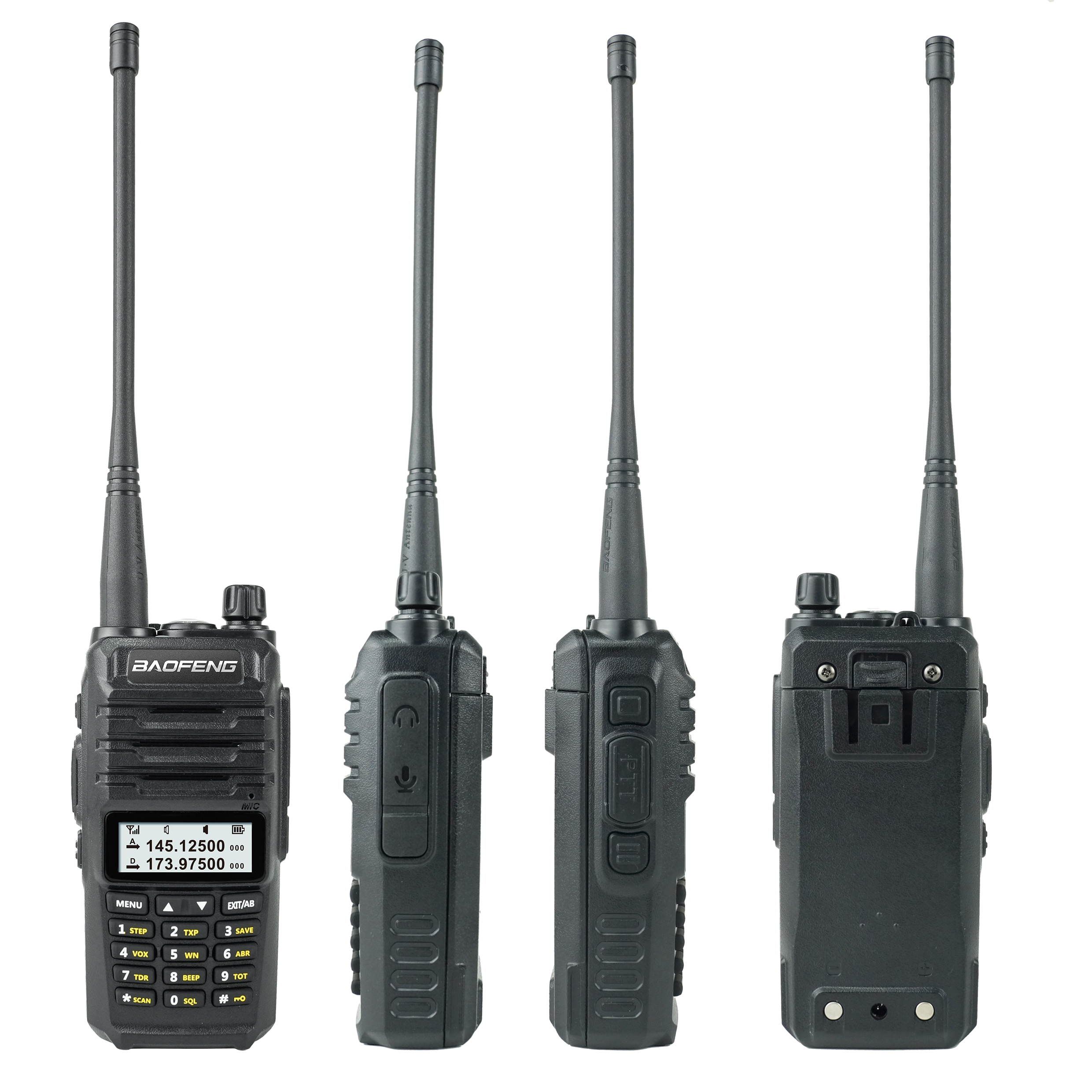 – DTMF encoded – Bult-in key lock – Tone end of transmission – VOX function – Noise Reduction Circuit – Long Communication Range – Battery Save.CTCSS/DCS – FM Radio – Dual Watch/dual reception – Bult-in LED flashlight General Frequency range 65MHz-108MHz(Only commercial FM radio reception) 136MHz-174MHz(Rx/Tx),200MHz-260MHz(Rx/Tx) 400MHz-480MHz(Rx/Tx) Memory channels Up to 128 channels Frequency stability 2.5ppm Frequency step 2.5kHz/5kHz/6.25kHz/12.5kHz/20kHz/25kHz Antenna impedance 50Ω Operating temperature -20℃to60℃ Supply voltage Rechargeable Lithium-lon mAh 7.4V/1800 Consumption in receptiom 380mA Consumption in transmission ≤1.4A Mode of operation Simplex or semi-duplex Duty cyde 03/03/54 min.(Rx/Tx/Standby) Dimensions 65mm*41.5mm*133.8mm Weight 279g(approximate) Transmitter RF power 5W/1W Type of modulation FM Emission class 16K¢F3E/11K¢F3E(W/N) Maximum deviation ≤±5kHz/≤±2.5kHz(W/N) Spurious emissions <-60dB Receiver Receiver sensitivity 0.2 μV(at 12 dB SINAD) Intermodulation 60dB Audio output 1W Spurious Radiation ≥65dB