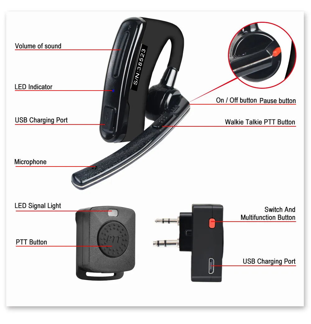 1 x Bluetooth headset 1 x Finger PTT 1 x Bluetooth adapter (K type) 1 x USB charging cable 1 x User manual