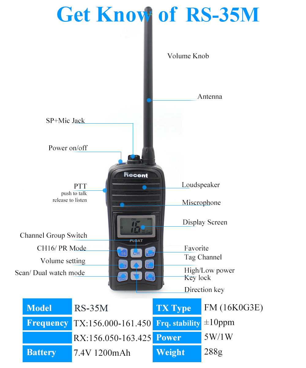Recent RS-35M Marine VHF Radio IP67 Waterproof International Weather Channel Float Walkie Talkie Auto Scan Portable Radio