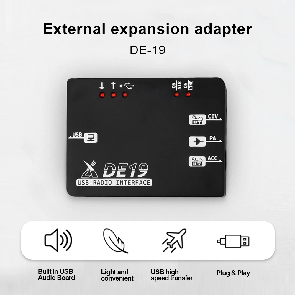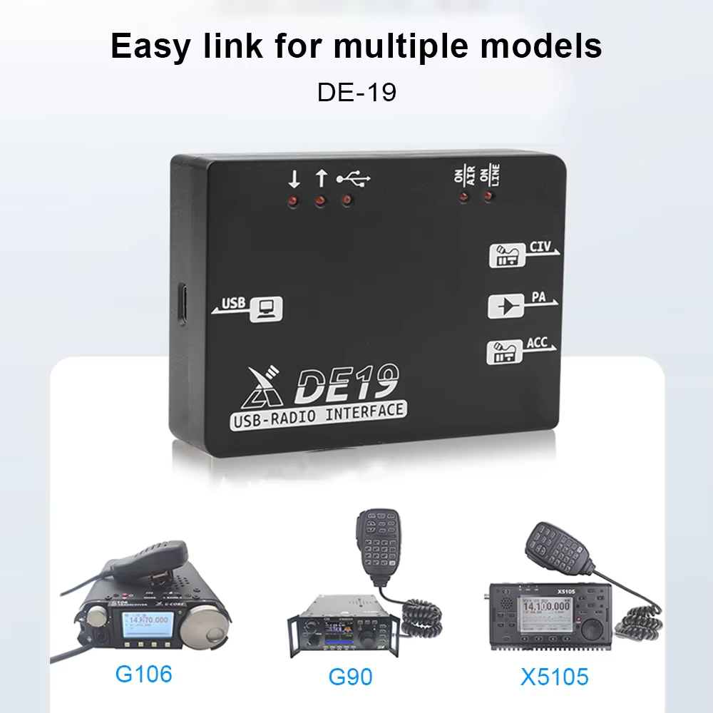 Xiegu DE-19 is an external expansion adapter. It integrates a USB interface unit, isolation, amplification unit, and interface units working with Xiegu G90, Xiegu G106, and Xiegu XPA125B. It can act as the external adapter for the foregoing models and is easy to connect to a PC for control or data communication.