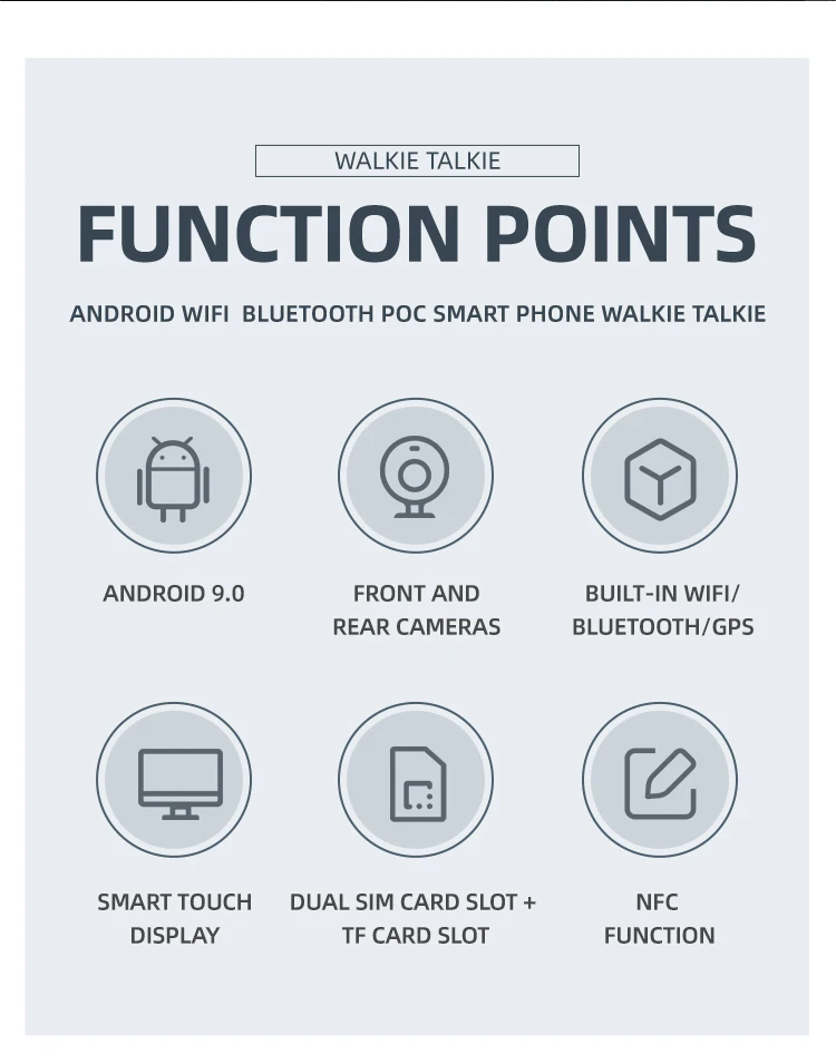 Android 9.0 Front and rear cameras Built-in Wifi/Bluetooth/GPS Smart touch display Dual SIM card slot + TF card slot NFC function