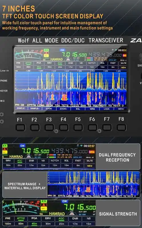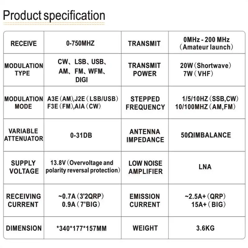 Features: – The most powerful enchantment! 3D waterfall spectrum diagram – 7″ multi-point touch screen (capacitive screen) displays clearly under strong light – Built-in Wifi. Online radio is displayed after networking – Built-in CW decoding and FT8 encode and decode (no additional device required) – Built-in TF card! Multiple recordings and playback! Recording call, CW mode with 5 recordings – Support TF card to upgrade – Multi-scene mode selection! Fully open source software and hardware can be modified as needed – Built-in USB sound card for easy connection – All aluminum anodizing housing! Precision design and production – Built-in antenna tuner (Only for RS-998) – LNA: Low noise amplifier – With band-pass filter Specifications: – RX Frequency: 0.5MHz-750MHz – TX Frequency: 0.5MHz-200MHz (Only Amateur Band) – Output Power (QRP++DB5AT Version): 20W (HF) and 7W (VHF) (RS-988) – Output Power (RU4PN/WF-100D Version): 100W (HF) and 50W+ (VHF) (RS-998) – Antenna Type: Dual Antenna Input – Modulation Type (TX/RX): CW, LSB, USB, AM, FM, WFM and DIGI – Variable Attenuator: 0-31dB – ADC Dynamic Range: ~100dB – Supply Voltage: 13.8V (Over-voltage and Polarity Reverse Protection) – RX Current: ~0.7A (3’2QRP) and 0.9A (7’BIG) – TX Current: ~2.5A+ (QRP) and 15A+ (BIG) – Dimensions (WxHxD): 340 x 140 x 135mm/13.4 x 5.5 x 5.3″ – Weight: 2903g/6.4lb